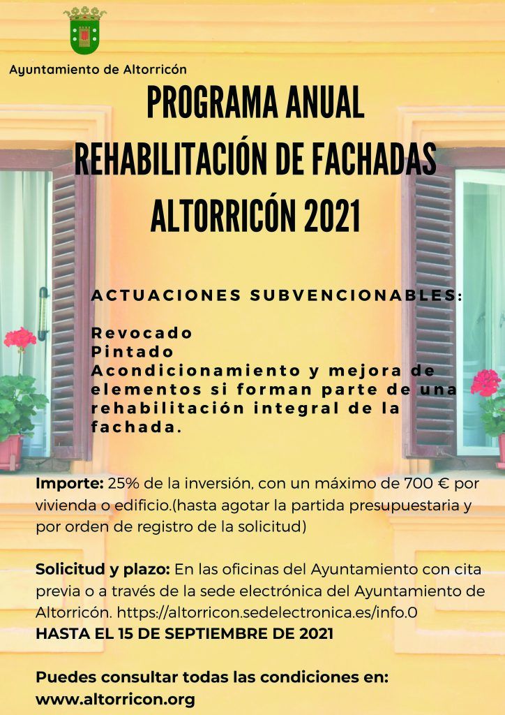 Todo vecino de Altorricón que esté interesado en rehabilitar o pintar la fachada de su vivienda de más de 10 años, puede solicitar ya al Ayuntamiento una subvención del 25% de la inversión con un máximo de 700€ de ayuda por vivienda. Requisitos, solicitud, plazos y documentación necesaria establecido en el Plan anual 2021 pueden […]